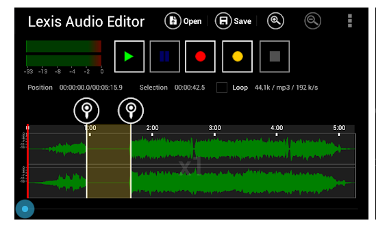 Open the emulator application and in it s search bar type lexis audio editor and search. On the search results page click lexis audio editor app icon. Open an existing or record a new file. Saving in mp3 format is available only in the paid version.